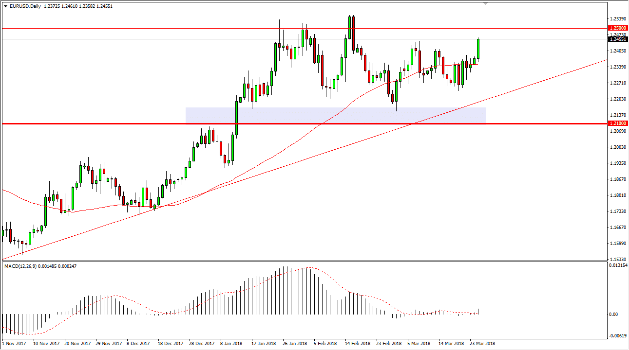The EUR/USD pair pulled back slightly during the trading session on Monday but found the 50-day EMA supportive enough to turn around and shoot to the upside. The 1.245 level was targeted, and I think we are eventually going to test the 1.25 handle, and then perhaps even break out for a much larger move. I think that short-term pullbacks will be buying opportunities, and I believe that we will focus on the 1.32 level eventually, based upon the break out above the top of a major bullish flag on the weekly chart. I think that the uptrend line will also be very supportive, just as the 1.21 level will be. So, at this point, I don’t have any interest in shorting this market, and I look at those pullbacks as an opportunity to take advantage of value. It will more than likely take several attempts to break above 1.25, but once we do we should take off.