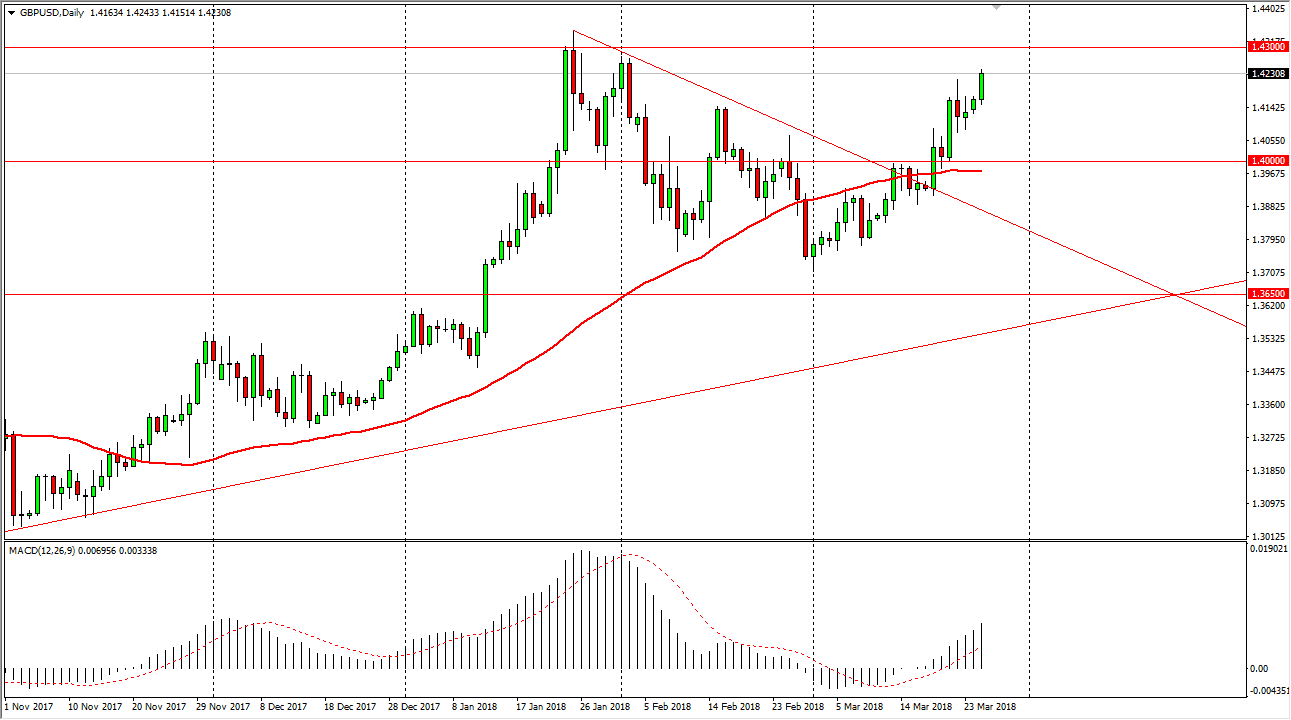 The British pound rallied during the session on Monday, breaking above the 1.42 level. You can see that we broke above a negative candle from last week, and now it looks likely that we were going to reach towards the 1.43 level. If we can finally break above that level, eventually we should then go to the 1.45 handle. The market has been a bit overextended, and at this point I think that the 1.40 level underneath is the “floor.” Ultimately, this is a market that should continue to grind higher as the Bank of England has suggested an interest rate hike is coming this summer. I believe that eventually the British pound will break the 1.43 level, but it may take several attempts as it was so resistive in the past. There is a lot of noise between here and the 1.45 handle, so it’s going to take a significant amount of momentum.