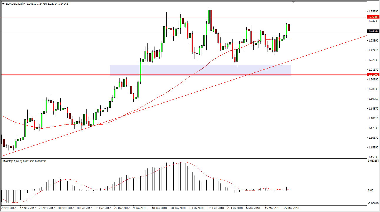 The EUR/USD pair initially tried to rally during the trading session on Tuesday but rolled over significantly to show signs of negativity. However, by the end of the day we bounced a bit and it looks like we continue to be very resilient about trying to break out to the upside. The 1.25 level above is massive resistance, and I think that if we can break above there, the market is free to go much higher, perhaps to the 1.32 handle over the longer term. I believe that the uptrend line underneath should continue to be very supportive, just as the 1.21 level should be as well. I think that the market continues to be very volatile, but it certainly seems to have a strong upward proclivity in general. I’m willing to buy short-term pullbacks, but only in small bits and pieces.
