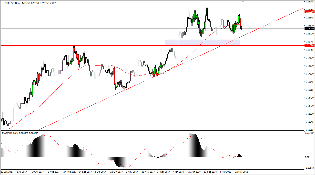The EUR/USD pair fell a bit during trading on Thursday but continues to find support just below the 1.23 level. I believe there is also some stringent support to be found near the uptrend line on the chart, and of course the 1.21 level underneath that. Because of this, I think it’s only a matter of time before the buyers return and therefore I remain bullish. I recognize that it will continue to be choppy, but when you look at the totality of the last couple of months, we have essentially gone sideways more than anything else. The 1.25 level above continues to be massive resistance, but I think that breaking above there is going to take a lot of work. I believe that essentially the market is looking at trying to build up enough momentum to do that exact move, but in the meantime, it will continue to be very choppy.