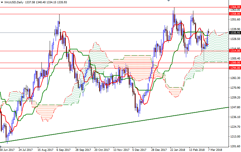 To the upside, keep an eye on the aforementioned resistance at 1340. If this is taken out convincingly, the market will be aiming for 1347/5 next. Closing above 1347 on a daily basis implies that the bulls are getting ready to challenge 1352.