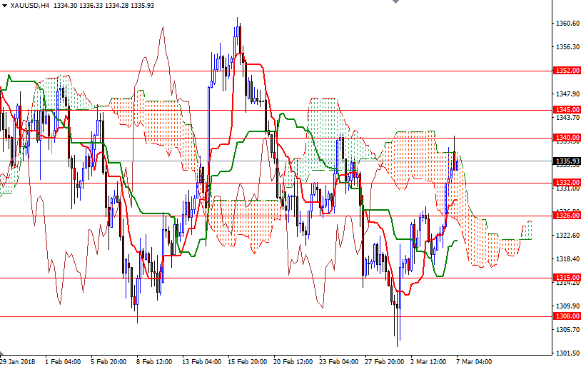 XAU/USD tested the 1340 level as expected after prices broke through the resistance in the 1333/2 zone, but it seems that reaching this strategic barrier triggered some profit taking. The failure to sustain a break above the 4-hourly cloud suggests that the market will revisit the 1333/2 area. If prices can’t hold above 1332, the market may grind lower to test 1329, the Tenkan-sen (nine-period moving average, red line) on the H4 chart, or even 1327/6. The bears have to drag the market below 1326 to gain momentum for 1322, the daily Tenkan-sen.