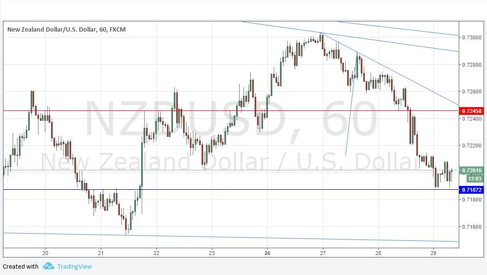 I wrote yesterday that the support levels nearby looked attractive and were likely to give bullish trade entries at bounces. I was wrong, in fact the price fell sharply and cut through several support levels. The technical picture has become more bearish, with steepening trend lines and a bearish confluence at around 0.7250 with a trend line, resistance and a key psychological level seeming very attractive for a short trade. However, the price has bottomed just a pip or two above the support level at 0.7187 which seems to be having an effect, so the most likely short-term move now looks like a bullish pull-back. I would be more comfortable entering a short trade than a long trade in this currency pair.