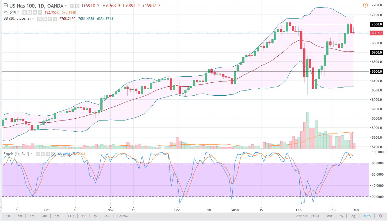 The NASDAQ 100 initially tried to rally during the trading session on Wednesday as well but found the 7000 level to be far too resistant. We have turned around to form a shooting star, and that suggests that we are ready to go even lower. If we can break down below the 6900 level, the market probably goes down to the 6800 level after that, perhaps even down to the 6700 level. That’s an area where I think it is massively supportive, so it’s only a matter of time before we can find buyers to push this market to the upside. However, it looks as if the next couple of sessions could be a bit soft. If we were to break down below 6700, that would be a very negative sign. I think eventually we will build up the necessary momentum to clear 7000 though, perhaps after some “weak hands” get flushed out.