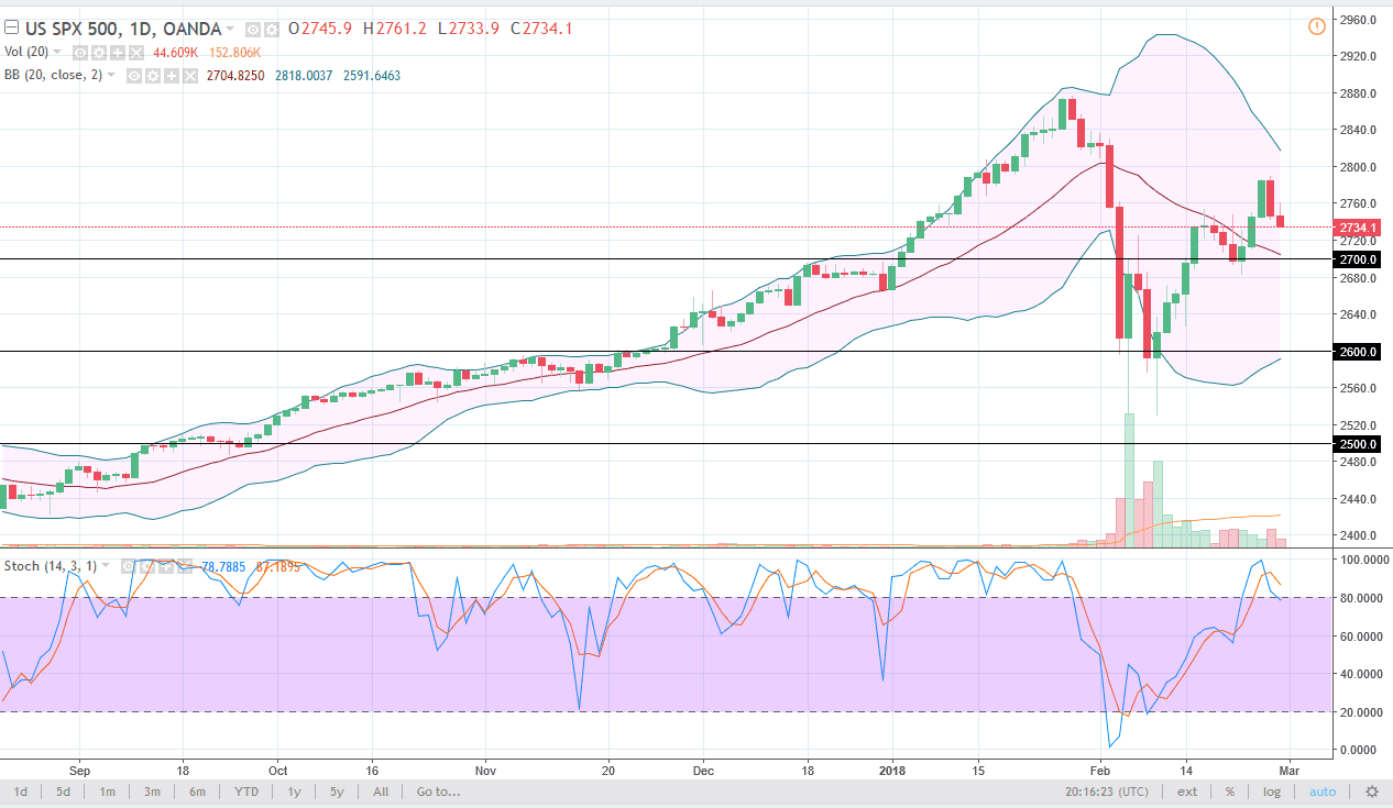 The S&P 500 initially tried to rally during the trading session on Wednesday but turned around at the 2760 level to fall rather significantly. By doing so, the market looks as if it is going to reach down towards the 2700 level. I think there’s a lot of support in that area though, so quite frankly it’s only a matter of time before the buyers return. If we break above the 2760 handle, that is a very bullish sign, perhaps sending the market towards the 2800 level. I believe that the 2700 level underneath will be massively supportive, and if that were to get broken to the downside, the market will probably go looking towards the 2650 handle. There is plenty of noise underneath that I think will continue to push the market to the upside. The 2800 level has offered resistance, but quite frankly it should be short term.