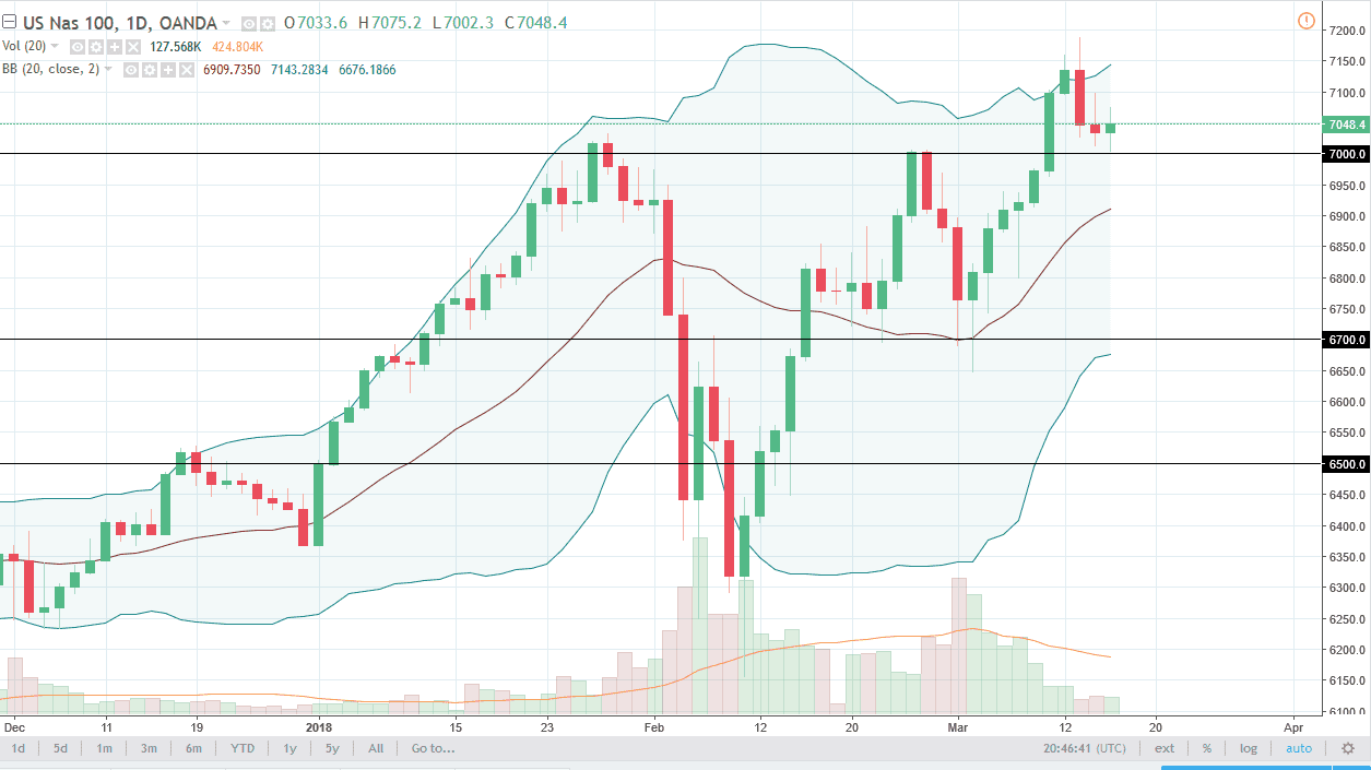 The NASDAQ 100 went back and forth during the trading on Thursday as well, testing the 7000 level for support. That’s an area that was previously resistant, and this is a market that I think will continue to go higher, especially if we can continue to find buying opportunities. I think the market then goes to the 7200 level above, which is the recent highs. If we can break above there, the market should continue to be a “buy-and-hold” scenario. I think that the 7000 level should end up being very important, so if we did breakdown below there, that would probably unleash this market to drop down towards the 6000 level. There are a lot of concerns around the world right now about trade wars, so headlines could come into play and cause massive amounts of volatility. However, if we stay above 7000, I remain bullish.