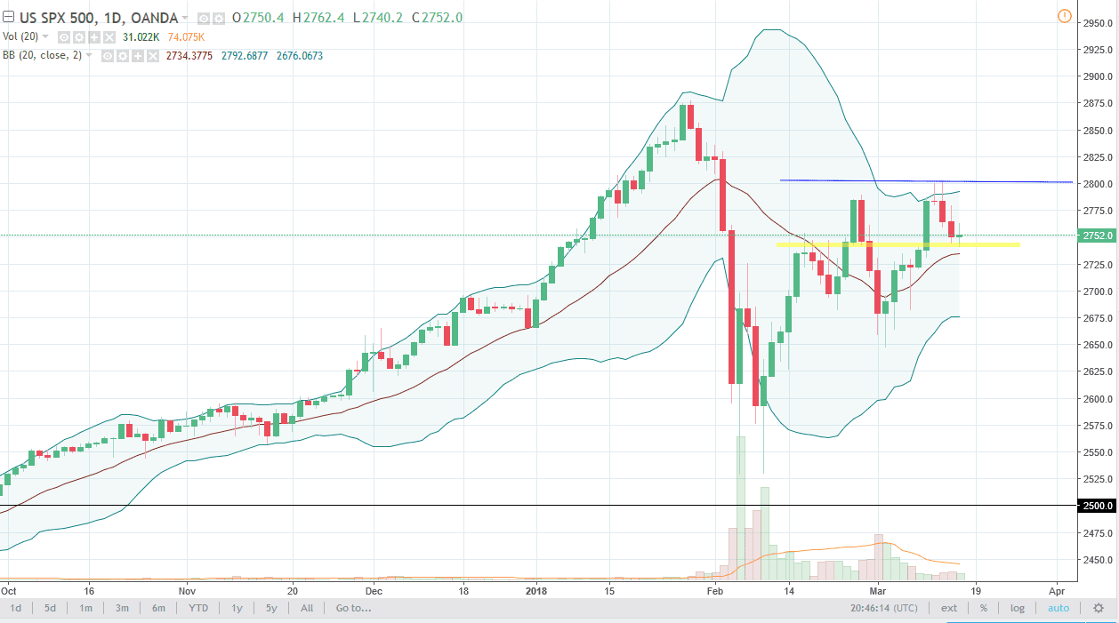 The S&P 500 went back and forth range trading on Thursday, testing the 2750 level. It looks as if the trade wars are still front and center as far as traders are concerned, and their fears. Because of this, we continue to struggle but I do anticipate that the buyers are coming sooner rather than later. If we break down below the bottom of the candle for the day, I anticipate that the 2700 level should offer support. Alternately, if we break above the top of the range for the day, then I think that we go back towards the 2800 level. I anticipate that things are going to be very noisy and choppy, but in general I’m not looking for some type of massive meltdown unless of course a trade war is started during the trading session.