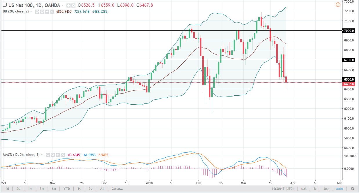 The S&P 500 went back and forth during the session on Wednesday, as we respected the 2600 level as support. This is an area that seems to be attracting a lot of attention, so I believe that if we can stay above there, the market will try to reach towards the 2700 level, perhaps even the 2800 level. If we break down below the 2600 level, we could have plenty of support show up somewhere near the 2500 level, as it is an area that has been important more than once. However, what I find the most interesting about this chart is that we have sat still at this area, showing that perhaps the market is finally calming down. I believe that the longer we go sideways, the better off this market’s going to be and potentially we could go higher as a result. I believe that this market will also move based upon talks about a potential trade war. If we break above the 2680 handle, the market should continue to reach much higher.