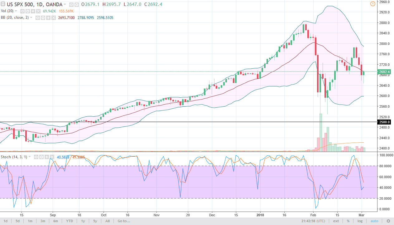 The S&P 500 has initially fallen during the day on Friday, reaching down towards the 2650 level before bouncing. By the end of the day, we ended up forming a nice-looking hammer, and that is of course a good sign that we are going to continue to find buyers in this market. If we can break above the top of the candle for Friday, the market should continue to go higher, perhaps reaching towards the 2800 level. While the markets are jittery after the talk of tariffs coming out of the United States, it looks as if people are starting to jump into this market to pick up value. However, a breakdown below the bottom of the candle for the session on Friday would be negative, perhaps sending the S&P 500 down to 2600.
