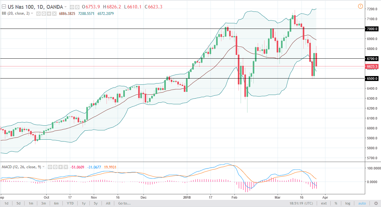 The NASDAQ 100 initially rally during the day, and broke above the 6800 level, but that was short-lived. In fact, we broke down so significantly that I think we are going to continue to bounce around. I think that the 6500 level below will be supportive, and that should be an area that will attract a lot of attention. If we break down below there, the market should then go down to the 6300 level. That’s an area that is massively supportive, so it’s likely that we would find buyers there as well. In general, though, I think that this market will probably continue to be very noisy, so I believe that although value hunters will return, it’s probably best to trade in small pieces as the market is a very dangerous as of late. However, if we break down below the 6300 level, this market probably falls apart completely.