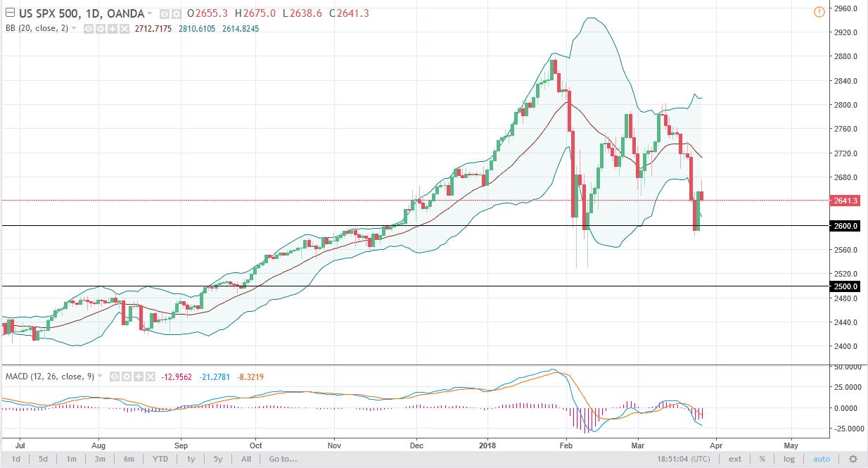 The S&P 500 initially rallied a bit during the trading session on Tuesday but rolled over at the 2680 handle. The market looks very soft, and it looks as if we will go back down towards the 2600 level. I think that the market continues to see a lot of volatility based upon various issues, and the fact that we cannot hold the gains for the session is not a good sign. Because of this, I think that the market will probably need to several days of consolidation with a slight upward bend to continue to go higher. I believe that there is even more support at the 2500 level, but what this uptrend needs now is a bit of stability. Staying out of this market might be the best trait of all, as there so much noise.