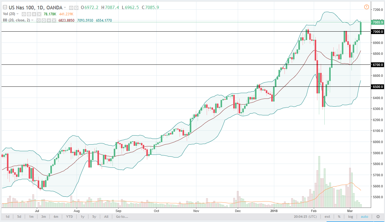 The NASDAQ 100 also rallied during the day, gaining a little over 1.5%. Importantly, we have broken above the vital 7000 level as we have made a fresh, new high and it looks as if the NASDAQ 100 will probably lead the way for the other US indices. I like buying dips, and I would anticipate that the 7000 level should be support going forward as it was such strenuous resistance in the past. I like the look of this market, and I believe that we will probably go to 7500 given enough time, perhaps even 8000 which is my longer-term target. It’s not until we break down below the 6700 level that I would consider selling this market, something that looks very unlikely to happen after this most recent move and of course the economic numbers on Friday. Expect volatility, but most importantly, I would expect a lot of bullish volatility.