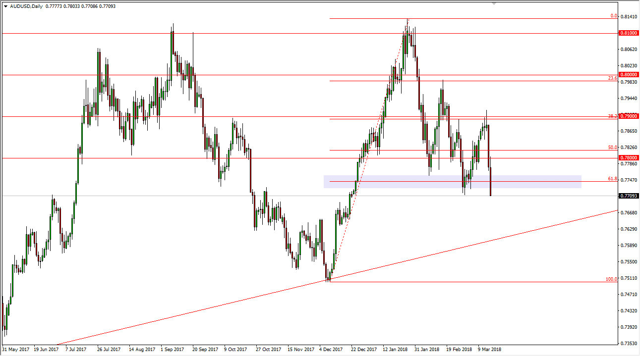 The Australian dollar broke down towards the 0.77 handle, an area that has been supportive recently. If we can break down below the 0.77 level, then I think the Aussie dollar continues to fall. This has been a brutal selloff over the last 48 hours, so I think it’s likely that we do continue to see selling pressure. However, somewhere near the 0.76 level, we have an uptrend line that has been the bottom of an up-trending channel, and that could bring in the buyers. If we were to break down below this uptrend line, then it’s almost a certainty that we go down to the 0.75 handle. I expect Monday to be negative, at least initially for the Aussie dollar, although I’m not expecting some type of wiped out.