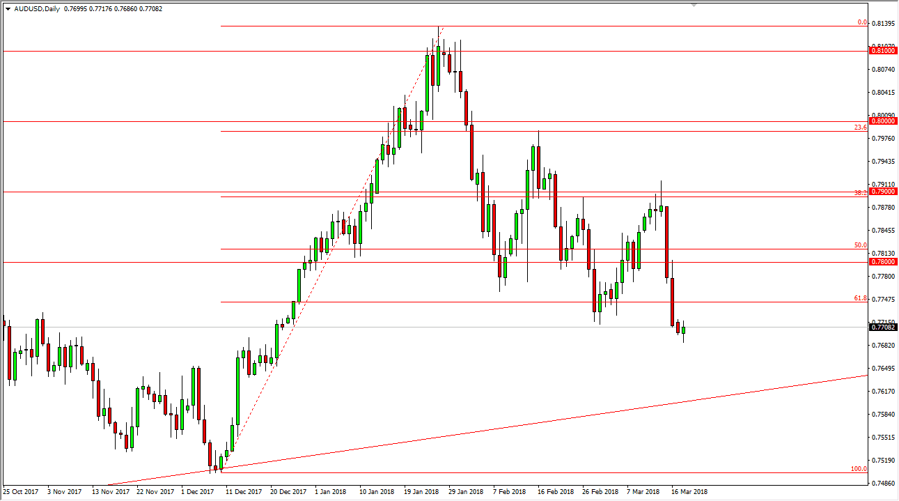 The US dollar initially spent most the day trying to rally against the Japanese yen but has struggled to retain any gains that have happened. Ultimately, we turned around to form a shooting star, and I think that shows just how “risk off” the market is starting to become. I believe that the 105.50 level offer support, and I think that the support extends down to the 105 level. If we break down below that level, I feel that this market goes looking towards the 100 handle. We have the Federal Reserve releasing a statement this week, and although an interest rate hike is expected, the question now becomes whether there are going to be 3 or 4 interest rate hikes this year. In the meantime, I think the market is going to chop around this area, but if we do get 4 interest rate hikes this year, that will be bullish for the US dollar.