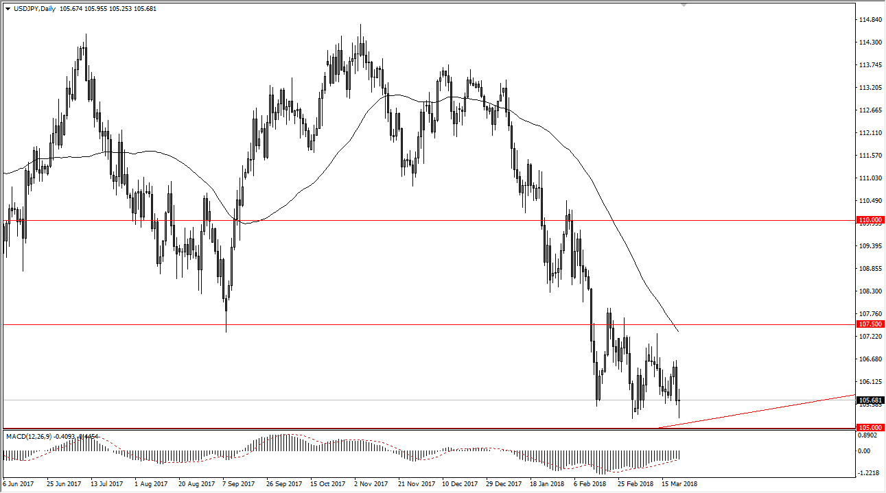 The US dollar was very noisy during the trading session on Thursday, as the world awaits the results of trade tariffs being levied on China from the United States. This could start a potential trade war, so obviously people were very cautious. The USD/JPY pair is very sensitive to risk appetite, and because of this we had seen a lot of noise. Currently, it looks as if the Chinese are weighing their options, but it’s ultimately that response that will move the market next. Ultimately, this market has a significant amount of support just below at the 105.50 level, that extends down to the 105 handle. If we were to break down below the 105 level, the market will almost undoubtedly unwind towards the 100 level over the next several sessions. I believe this would be in reaction to some type of Chinese retaliation that was stringent. Right now, it looks as if they are ready to consider their options.