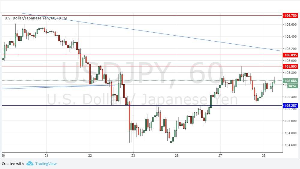 I wrote yesterday that I had no directional bias, and that the price was likely to consolidate within its zone. This was an accurate approach, as the price has in fact remained stuck between 105.26 and 105.90. The price is currently moving up after making a low not far from 105.26. There is a long-term bearish trend, but there seems to be plenty of support at 105.26 and below. I maintain no directional bias and would be equally happy at trade entries off rejections of any levels. If the price makes a sustained break above 105.90, or the bearish trend line shown in the price chart below which is currently confluent with the resistance level at 106.10, that would be a sign that a more bullish picture is taking shape.