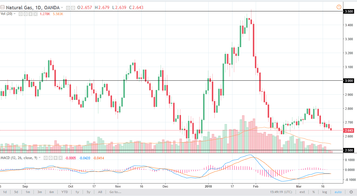 Natural gas markets initially tried to rally during the session on Thursday but turned around to form a shooting star like candle. The market suggests that the $2.70 level is offering resistance, but I think that we are low enough that perhaps a bounce is needed. In the short term, it doesn’t look like we’re going to get it, but I would be more than willing to sell rallies as they show signs of exhaustion. The $2.80 level was massive resistance, and I think a bounce to that area would invite fresh sellers. The $2.60 level extends down to the $2.50 level as far as support is concerned, and a breakdown below the $2.50 level would be catastrophic. I continue to sell short-term rallies in small positions, as we continue to see a lot of negativity.
