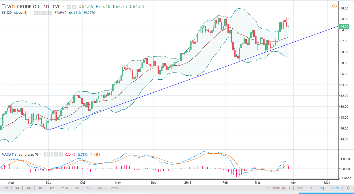 The WTI Crude Oil market has been noisy during training on Wednesday, dropping as low as $64 before bouncing. By the end of the day, we formed a bit of a hammer, so it looks as if the buyers are willing to step in and pick up these dips, and I think that is going to continue to be the way this market goes, buyers stepping in every time there is a bit of weakness. I think that the uptrend line continues to keep this market afloat, so it’s not until we break down below that uptrend line that I would be interested in shorting. Eventually, if we can break above the $66 handle, the market is probably ready to continue to go higher. I believe that the overall attitude of this market is short term focus, but right now it appears that the buyers are in control.