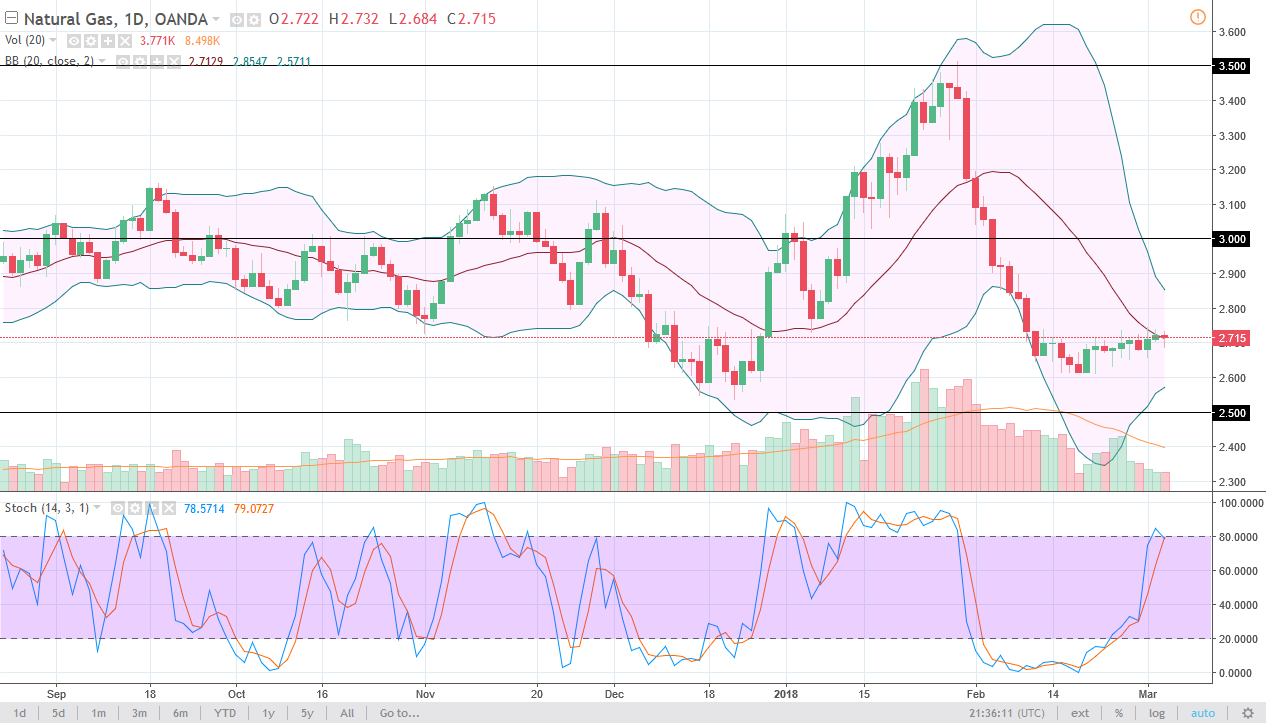 Natural gas markets were slightly negative during the day on Monday, but ultimately ended up forming a bit of a hammer. That’s a bullish sign in general, and I do think that we will continue to go higher. I think that the market will eventually reach out to the upside, but it will struggle at the same time. I recognize that there is a lot of negativity attached to natural gas, as we have so much in the way of oversupply longer term. However, in the short term it looks as if inventories are continuing to shrink. However, once we get out of the cold weather in the United States, that should correct itself, and I believe that any rally at this point is going to be a bit of a “dead cat bounce” that you can take advantage of. Patience will be needed to take advantage of that scenario though.