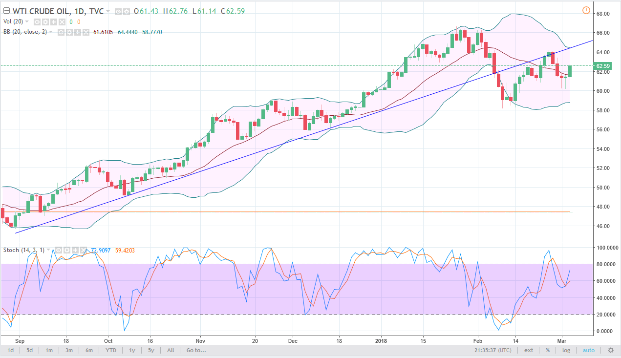 The WTI Crude Oil market rallied a bit during the day on Monday, breaking the top of the hammer from both Friday and Thursday of last week, so it shows signs of significant strength above that could cause a bounce to the $64 level. I think that the $64 level above should be resistive though, mainly because we have a previous uptrend line that should be resistive is sitting just above. Ultimately, I think that as soon as we get some type of exhaustive candle, I will be more than willing to start shorting this market. I think that the market sees the $60 level as a massive support level, but I think that we will eventually break down there and go to the $58 level. Ultimately, I’m not interested in buying unless we make some type of “higher high.”
