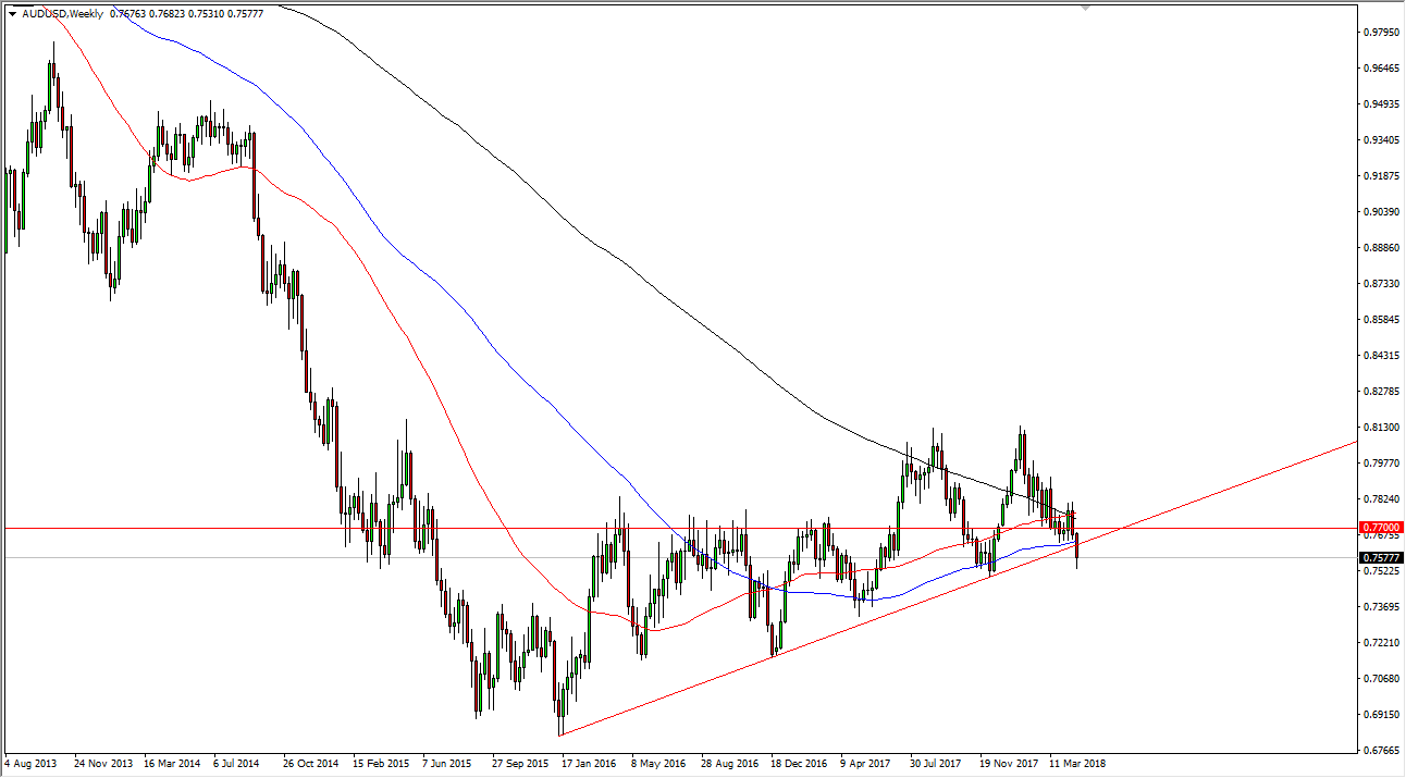 The alternate scenario of course is that we break above the 0.77 handle, and that should send this market much higher, perhaps towards the 0.80 level. That would also prove the market breaking through the uptrend line as a “false breakdown”, which of course is something that shows just how bullish the market is. Currently, I think that we have a lot of volatility just waiting to happen, and of course gold will have its usual influence. The question now is do we break above the 0.77 handle and start buying, or do we break down below the 0.75 level and see this market unwind? I anticipate that the month of May will determine where we go for the next several months, if not the next couple of years.