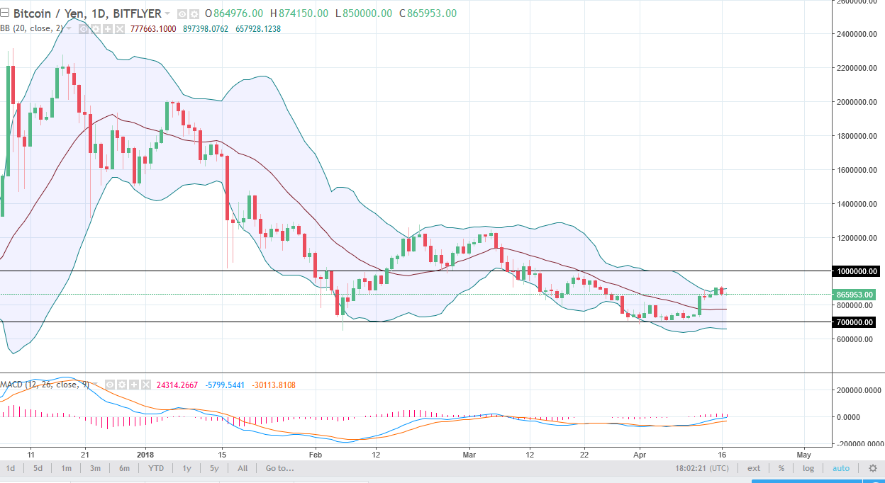 Bitcoin markets have been very noisy against the Japanese yen as well, showing signs of consolidation. The ¥700,000 level underneath is support, while the ¥1 million level above is resistance. I think that the market breaking above the ¥1 million level will allow the market to go to the ¥1.25 million level. However, I think that we will continue to have a lot of issues, and ultimately this volatility will lend itself to short-term back and forth range bound trading. Use some type of range bound system to get involved, perhaps using something along the lines of the stochastic oscillator.