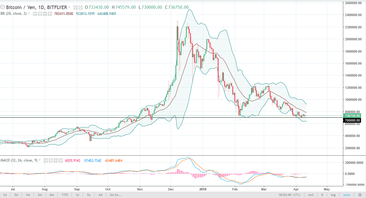The Bitcoin market did very little against the Japanese yen as well, as we continue to see support at the ¥700,000 level. Ultimately, I think that if we break down below the ¥700,000 level, we probably will go looking towards the ¥600,000 level. Rallies at this point are selling opportunities until we can break above the ¥1.1 million level, something that doesn’t look very likely to happen. I’m looking for exhaustive candles to start shorting, or a breakdown. However, in the meantime it’s likely that we will continue to see a lot of choppiness and volatility, so I would keep my trading size rather small, as the choppiness could get you heard if you weren’t very careful. Pay attention to this chart, it typically tells us where the rest of the crypto currency markets are going.