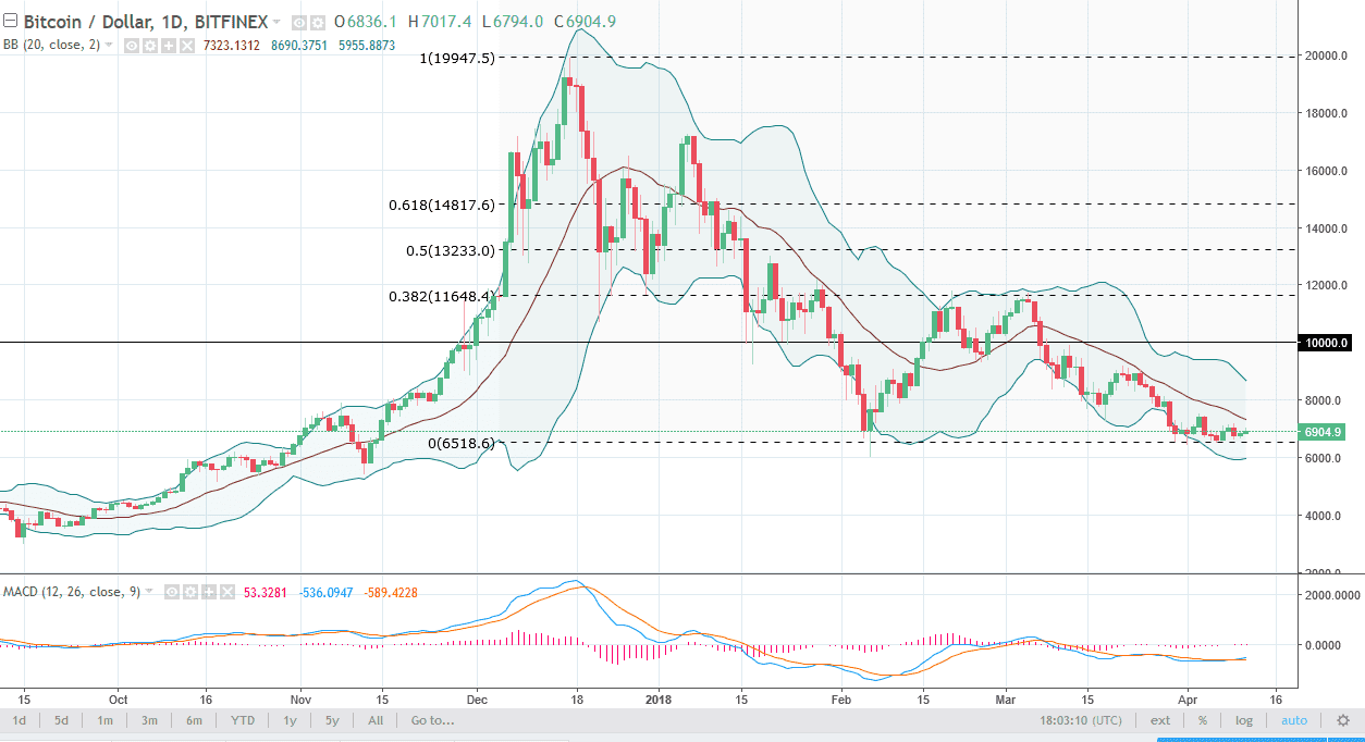 Bitcoin rallied slightly during the trading session on Wednesday, which of course is better than it has been acting lately. The $6500 level has offered support, which I think that the market needs. The $6000 level below is the bottom of that support, so it’s not until we break down below that level that I think we are clear to start short selling with any type of gusto. However, the one thing that I would point out is that the range of trading has been rather tight over the last several sessions, so I think we are essentially looking at a market that is very stagnant. If we did rally from here, I think that there will be sellers coming back in on signs of exhaustion, and that’s exactly how I plan to play this market. However, if we were to break above the $8000 level, we could go looking towards the $9000 level.