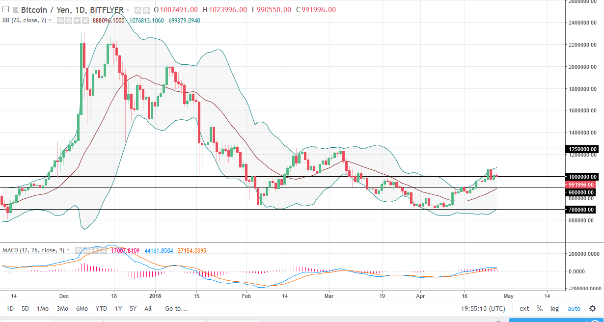 Bitcoin markets tried to rally against the Japanese yen but gave back the gains and broke below the ¥1 million level on Friday. The market looks as if it has support below at the ¥900,000 level, just as we have resistance at the ¥1.1 million level. If we can break above the ¥1.1 million level, then the market probably goes to the ¥1.25 million level. If we break down below the ¥900,000 level, the market could unwind down to the ¥700,000 level again. I think Bitcoin continues to be very noisy, so I think you need to trade this with a small position, and then add if the market goes in your way. Overall, this is a range bound market but if we can finally break above the ¥1.25 million level, the market should go higher.