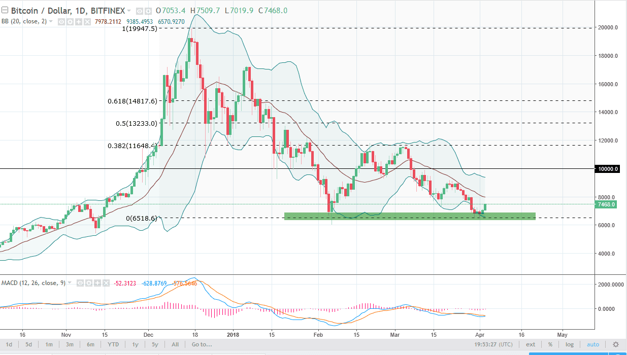Bitcoin traders rallied during the day on Tuesday, gaining about 6%. This is a very bullish sign, and now that we are approaching the $8000 level, we will also be testing the 20 SMA, which is in the middle of the Bollinger Bands. Ultimately, this is a market that I think continues to see bearish pressure longer term, so this rally, although nice, suggests to me that it’s more of a dead cat bounce, and that sellers will be looking for reasons to short this market above. If we were to roll over and break down through the lows, that’s obviously catastrophic and should send going down to the $4000 level. We don’t have the exhaustive candle that I would like to see to start shorting yet though, so I would be doing so right here. I anticipate that the $8000 level will bring out some sellers, and $9000 most certainly will.