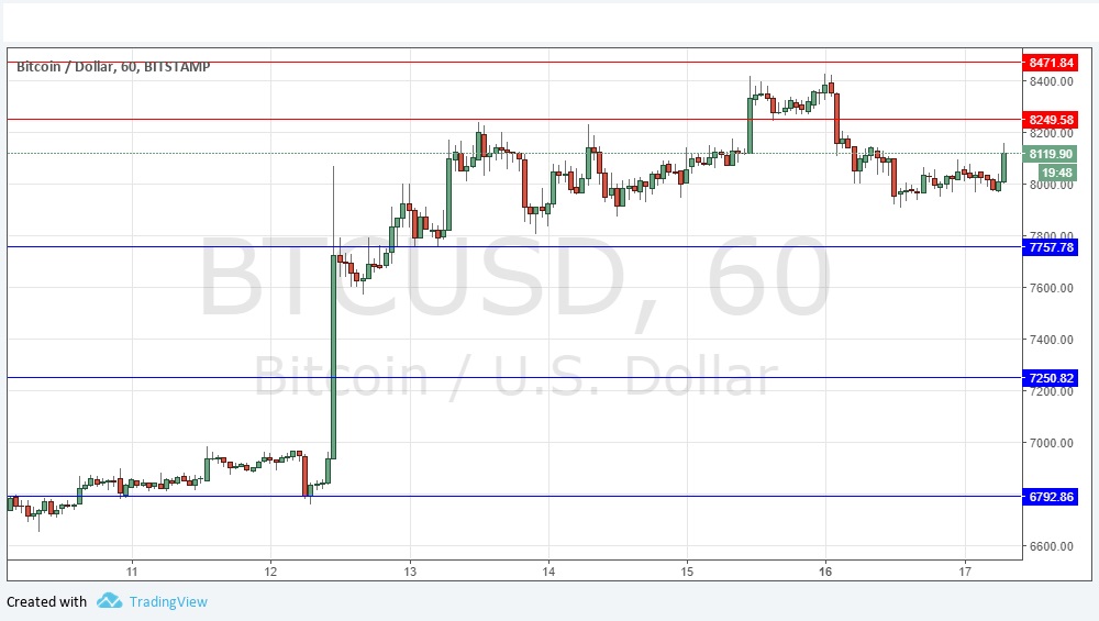Yesterday I took a bullish bias. The price is now about where it was 24 hours ago, so the outcome of that has been essentially neutral. I am still inclined towards a bullish bias, as the price has continued to hold up after such a strong upwards movement last week, despite the long-term bearish trend. The problem for the bulls is that the price now faces an area of resistance above. It will probably need to consolidate further before getting enough strength to break above it. Technically, there are buyers below $8,000. I think the price will still need to reach at least $8,250 before it can move down again, so if it hits the support level first and bounces bullishly, that would be likely to be the best possible set-up.