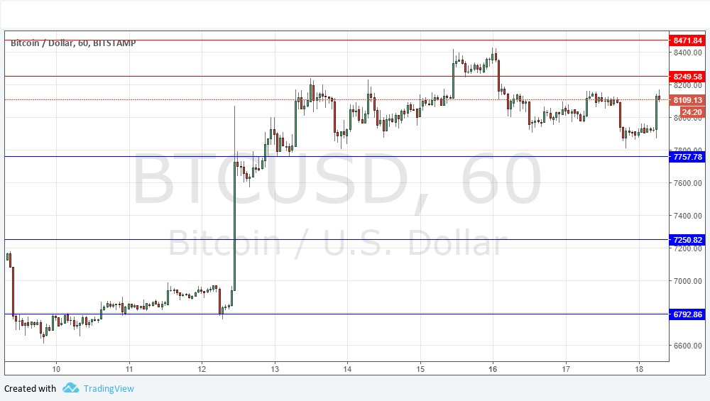 The price has remained between support and resistance over the past 24 hours. I still had a slight bullish bias yesterday and there is some buying going on. The technical picture is perhaps changing slightly, as the price does not seem to be able to rise, and we might be seeing a topping-out now with lower swing highs, which are starting to hint at a bearish head and shoulders pattern. It is hard to say what is most likely to happen next. I still have a slightly bullish bias as long as the support at $7,758 continues to hold.