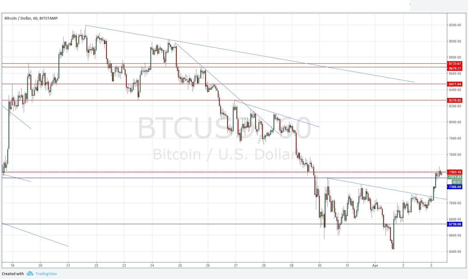 Yesterday’s signals were not triggered, as there was insufficiently bearish price action at $7,335.
