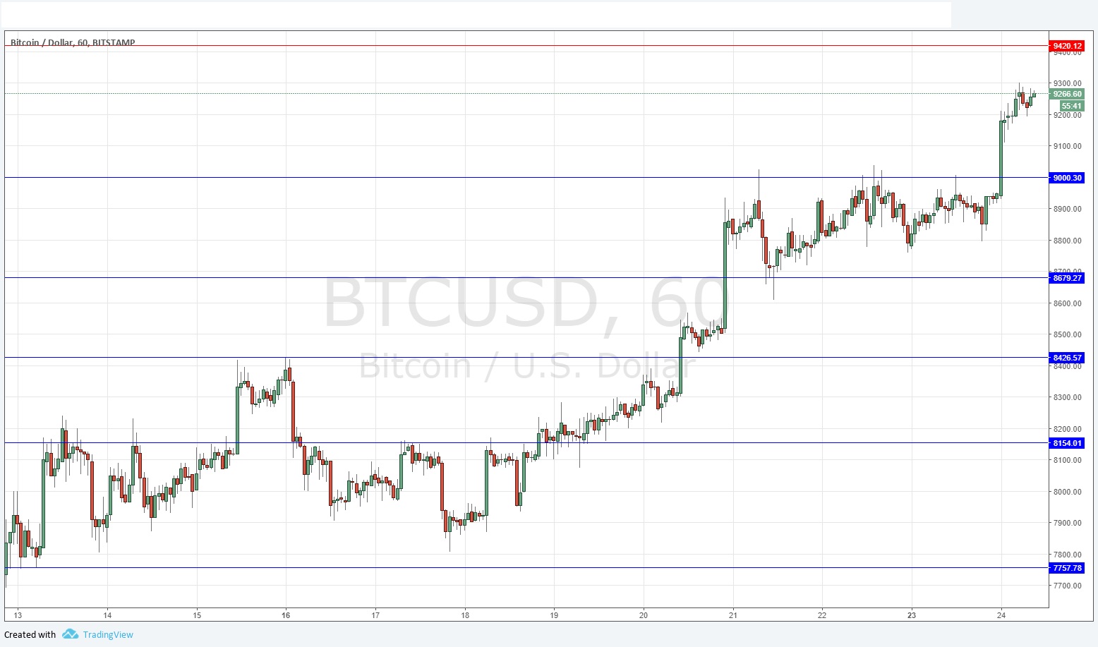 I wrote yesterday that I had a bullish bias. This has paid off well, as the price has strongly broken out above the resistance which I noted at the round number of $9,000. This level has probably flipped to become new support. The action still looks quite bullish and I maintain my bullish bias as the price goes on to make new multi-week high prices.