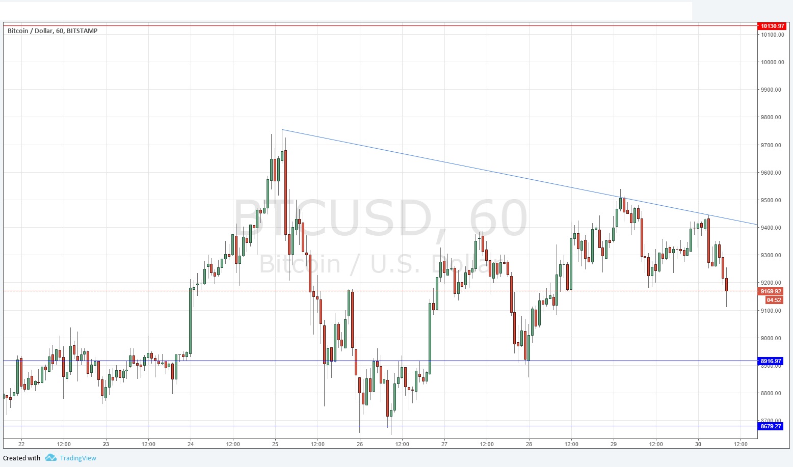 Short entry after a bearish price action reversal on the H1 time frame following the next touch of the bearish trend line shown in the price chart below which is currently situation at about $9,425.