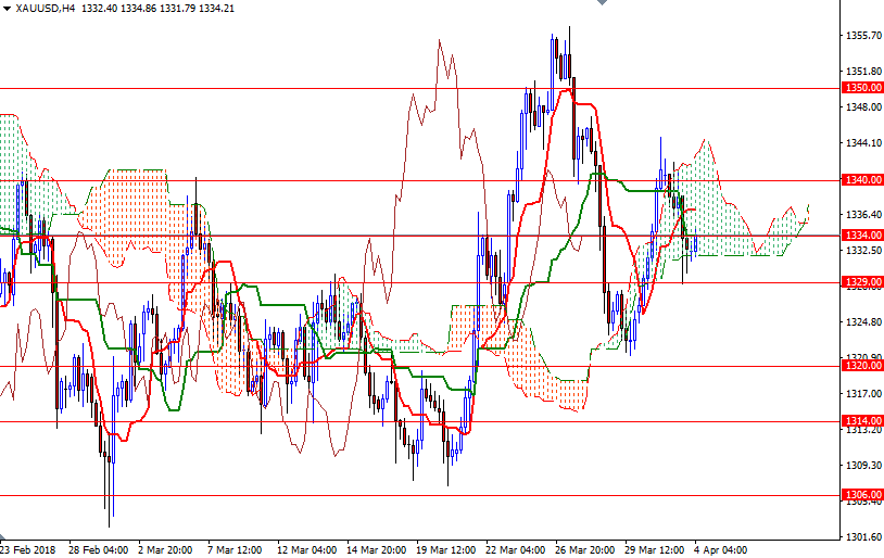 Gold prices dropped $7.98 an ounce on Tuesday, pressured by climbing stocks and a strong dollar. Some chart-based selling was also behind gold’s 0.59% drop yesterday. XAU/USD headed back to the anticipated support in the $1329-$1328 area after the market failed to climb above the 4-hourly Ichimoku cloud. The market will focus on upcoming economic releases, particularly U.S. monthly employment report, and a speech from Federal Reserve Chairman Jerome Powell on Friday.