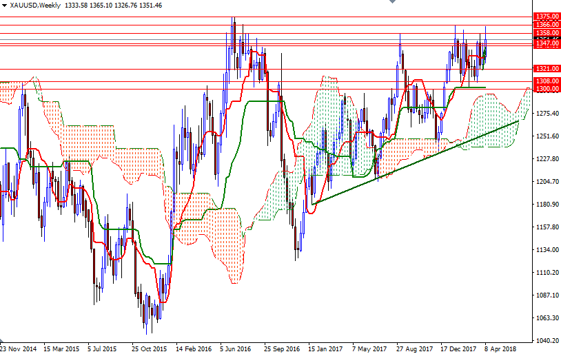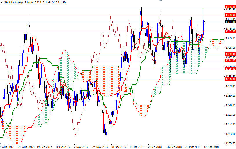 XAU/USD traded as high as 1365.10 after the market pierced through 1347/5, but gave up some of its gains following the Federal Reserve released minutes from its latest policy meeting. The market is trading above the Ichimoku clouds on the daily and the 4-hourly charts, suggesting that the bulls have the firm overall technical advantage. Positively aligned Tenkan-Sen (nine-period moving average, red line) and Kijun-Sen (twenty six-period moving average, green line) on both charts as well as Chikou Span (closing price plotted 26 periods behind, brown line)/Price crosses in the same direction are also inspiring the technically biased buyers. Although the charts indicate that there will be more upside price action, I can’t rule out a retreat towards 1347/5 before heading higher.