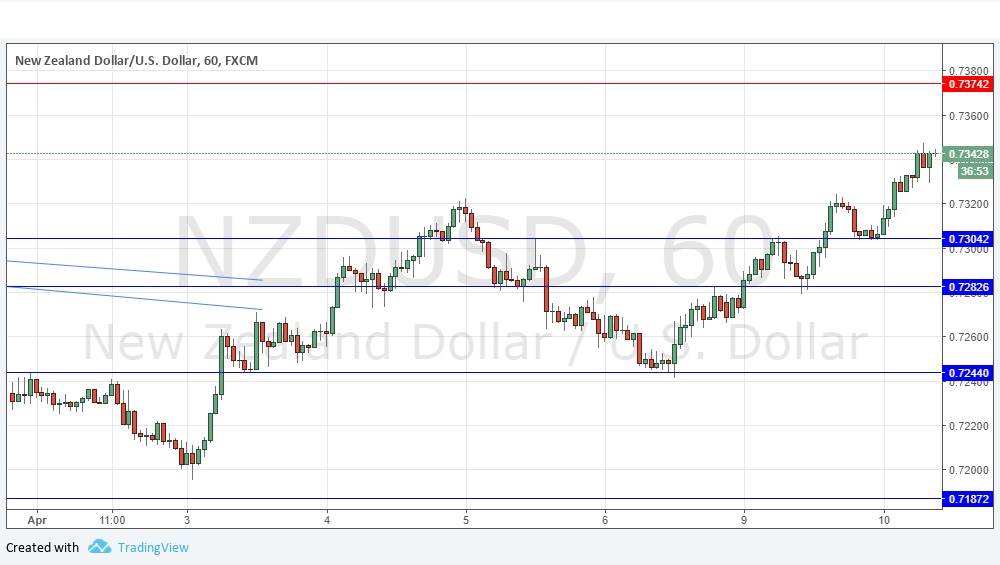 Yesterday I took a bullish bias above 0.7280 and this worked out very well, with the price pulling back to that area and then continuing to advance to make new highs, while printing new support levels along the way. There is no reason not to keep being bullish, especially as this move is in line with the long-term bullish trend in this pair. It is true that there is a major resistance level not very far away at 0.7374, but it is worth being very careful before taking a short trade at any bearish reversal which might happen there.NZDUSD