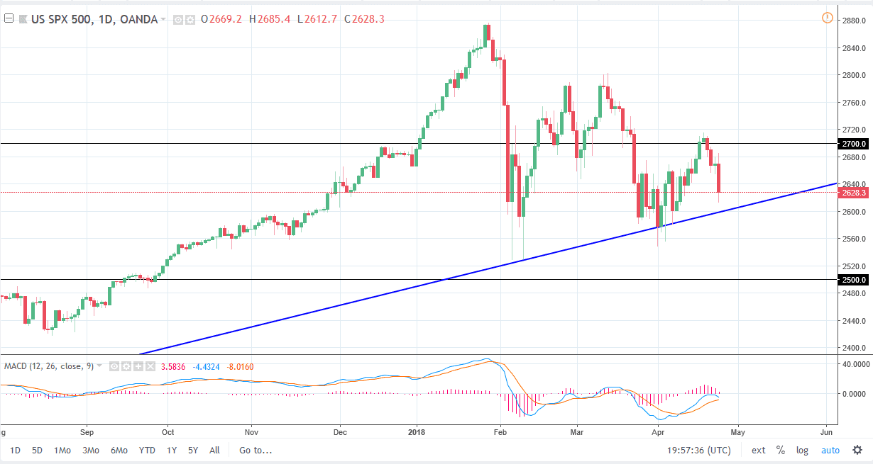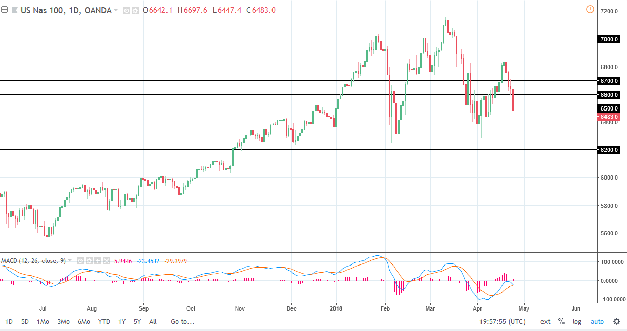 The S&P 500 initially tried to rally during training on Tuesday but found the 2680 level to be too resistive. We rolled over from there rather significantly, reaching towards the uptrend line underneath. We did hold above there, so that’s a good sign. I think that the market reacting to 10-year treasury yields breaking above 3% has been a bit overdone, and I anticipate that we will have buyers jumping into this market sooner, rather than later. Pay attention to the uptrend line, if it holds that’s a good sign and I am using 2600 as a proxy for that level. If we break down below there, the market probably goes down to the 2500 level. I believe in general, it’s only a matter of time before the buyers come back in based upon value hunting, but we are most certainly seen a lot of noise and fear in the market. You are going to be tested to say the least if you do choose to try to go in and go long in this market. Alternately, if we break down below the 2500 level, it’s likely that this market will unwind rather drastically and offer plenty of shorting opportunities.