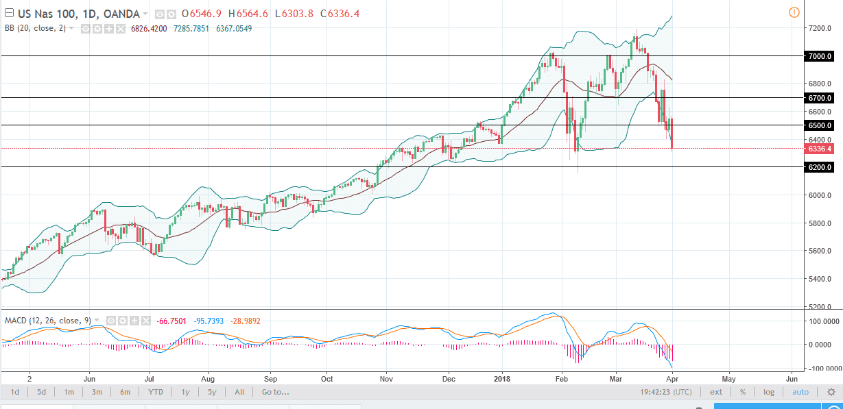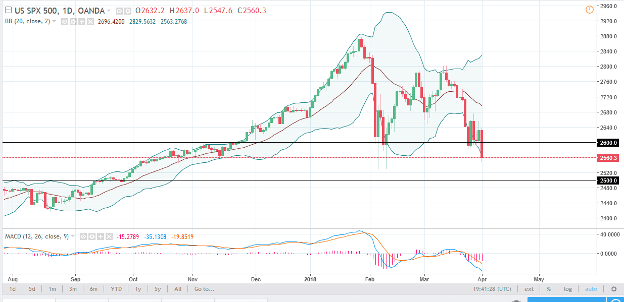 The S&P 500 broke down significantly during the trading session on Monday, clearing to a fresh, new low. There is a significant amount of support just below though, especially near the 2550 level. Beyond there, we should see a significant amount of support at the 2500 level as well. There continues to be a lot of fear when it comes to the potential of a trade war, as well as an underlying weakness that we have seen for a while. I think that the 2500 level being broken to the downside would probably send this market reeling, and down to extraordinarily low levels. I think that between now and Friday, we will continue to dance around, so I’m not looking to put a lot of money into the market, as we could get sudden swings and volatility until we get the jobs number. Once we get that hurdle out of the way, the market might be able to make up its mind.