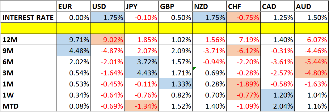Let’s take a look at the relevant data of currency price changes and interest rates to date, which we compiled using a trade-weighted index of the major global currencies: