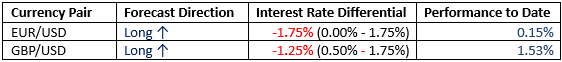 This month, we forecasted that the best trades would be long EUR/USD and long GBP/USD. The performance so far is as follows: