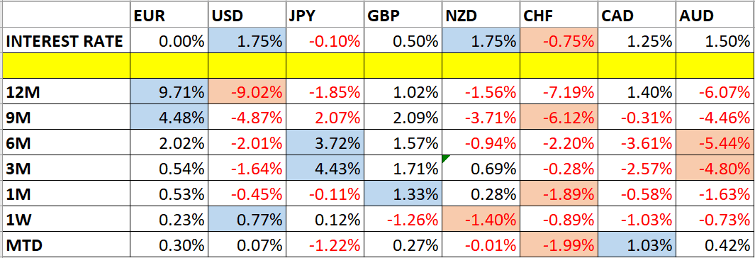 Let’s take a look at the relevant data of currency price changes and interest rates to date, which we compiled using a trade-weighted index of the major global currencies:
