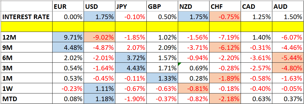 Let’s take a look at the relevant data of currency price changes and interest rates to date, which we compiled using a trade-weighted index of the major global currencies: