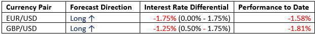 This month, we forecasted that the best trades would be long EUR/USD and long GBP/USD. The performance so far is as follows: