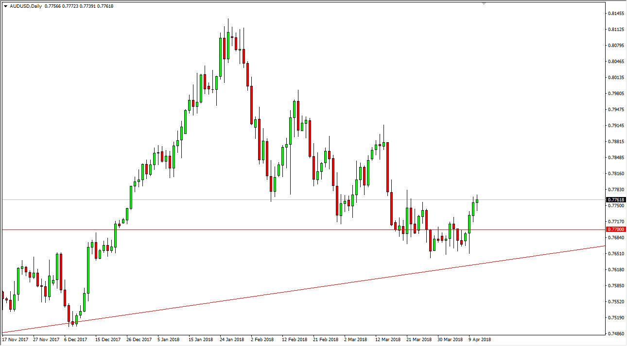 The Australian dollar has gone back and forth during the trading session on Wednesday, showing the lot of volatility as markets are trying to figure out which direction they want to go, based upon the risk appetite coming from the talks between the United States and China. I believe that the potential trade war will continue to weigh upon the Australian dollar, but if we get a cooling of tensions, that should push the Aussie higher as the Australian dollar is highly leveraged to the Chinese economy overall. The uptrend line on the daily chart also helps, and I think keeps this market somewhat stable. If we were to break down below the uptrend line, then the market goes looking towards the 0.76 level.