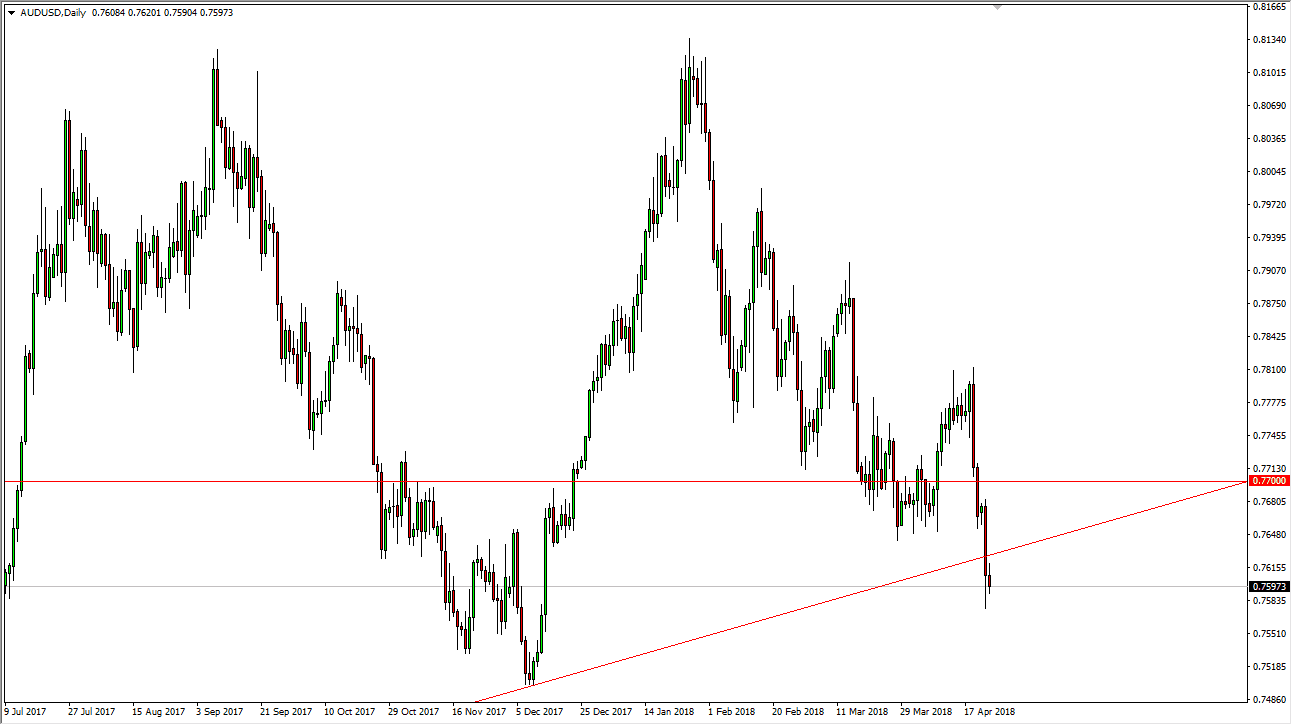 The Australian dollar broke down below the uptrend line on Monday, but on Tuesday was a bit quiet. I think if we can break down below the bottom of the Monday candle, the sellers would come in and overwhelm the buyers. We should then go to the 0.75 level underneath there, which is a large, round, psychologically significant number. I think that we would not only reach towards that level but go much lower than that. The alternate scenario of course is that we break above the uptrend line again, perhaps showing signs of strength. However, I would be cautious about buying this market until we break above the 0.77 level as it is a large, round, psychologically significant barrier, and is also an area of previous consolidation and noise. At that point, the market could continue the longer-term uptrend.
