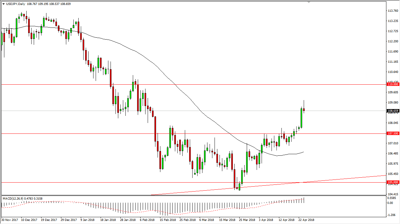 The US dollar has rallied initially during the trading session on Tuesday, reaching above the 109 handle. However, we have turned around to form a bit of a shooting star as stock markets in America roll over. This was in reaction to higher interest rates in the treasury market, and I think this could have the markets cooling-off a bit. The shooting star of course is a sign of negativity, and I think that if we break down below the bottom of the shooting star, it’s not necessarily that we are going to break down, but perhaps we will turn around and try to pick up momentum underneath. The alternate scenario is that we break above the top of the shooting star which could send this market to the 110 handle. This is a bullish move, but I think we are more than likely going to see a bit of a dip in the short term.