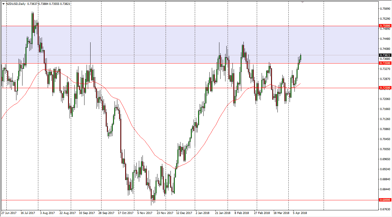 The New Zealand dollar has rallied a bit during the trading session on Thursday, as we continue to see buyers jump into this market. I believe that the 0.74 level will be targeted, and then eventually we could see a move towards the 0.75 above there. I think that short-term pullback should offer buying opportunities, with the 0.7250 level offering a bit of a floor. I think this market continues to be very noisy and driven by what is going on as far as risk appetite is concerned. Pay attention the stock markets, and if they continue to rally it should send this market higher. Other than that, commodity markets have their usual influence on the New Zealand dollar as well, so if they rise, we should see strength here also.
