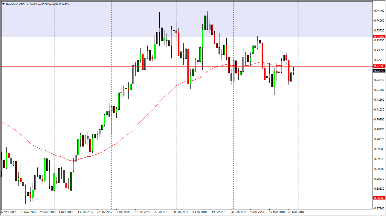 The New Zealand dollar initially rallied during the day on Friday but found the 0.7250 level to be a bit too resistive. The 50-day EMA has offered resistance as well, and therefore we ended up forming a shooting star. The shooting star of course is a negative sign, so a breakdown below the bottom of the candle could send the market looking towards the 0.7175 level again, but if we break above the top of that, we not only cross the 50-day EMA, but we also clear the 0.7250 level, which would be a short-term bullish signal. I believe that this market continues to be noisy in general, but I think that we will continue to see buyers trying to pick up a little bit of value. However, a fresh, new low would unwind this market back down to the 0.70 level.